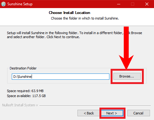 Click on I Agree - Next, you’ll be asked the destination path of the Sunshine app. Accordingly, choose the desired path by clicking on Browse. When done choosing, click Next.