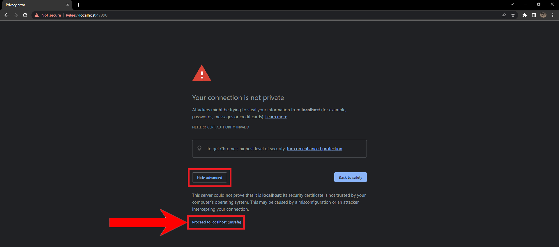 Paste and hit Enter - A warning page will appear that will inform you that the website is unsafe. Ignore it and click on Advanced and then click on Proceed to localhost (unsafe).