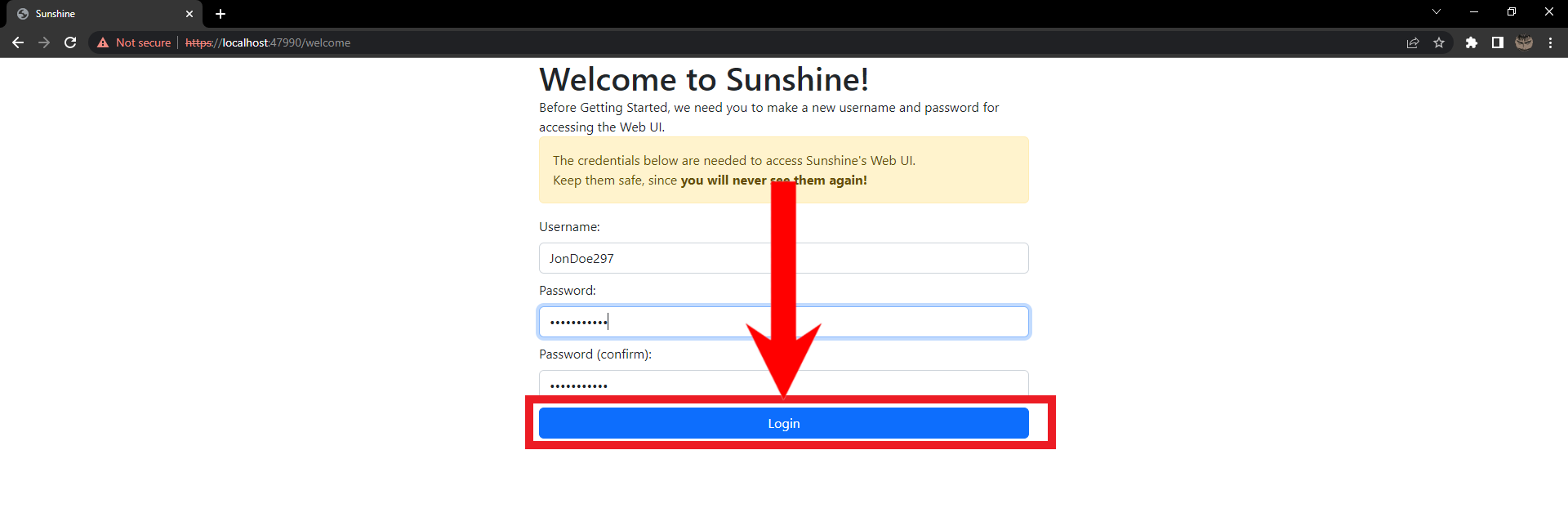 Click on Proceed to localhost (unsafe) - After that, you’ll be directed to a sign-up page. Enter your desired username and password and click Login