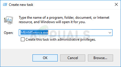 - After that, click on New >> Task and type in “MBAMService.exe” in the Run new Task windows which pops up.