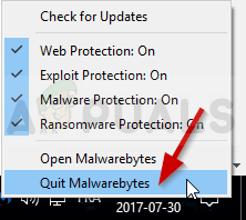 - Right-click on the Malwarebytes system tray icon at the bottom right part of your screen and click on the “Quit Malwarebytes” option.