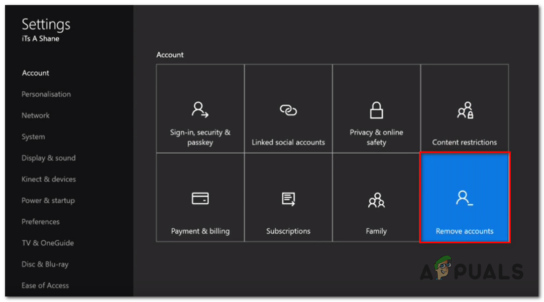 Opening All settings – Xbox - Once you’re inside the Settings menu, go to the account tab. Once you get there, move over to the right-hand side and choose to Remove accounts.