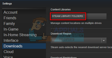 - Once you are in the Settings, navigate to the Download tab present at the left side of the screen. Here will see a button named “Steam Library Folders”. Click it.
