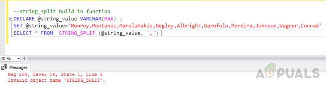 Now, we will call the “STRING_SPLIT” function to split a string delimited by commas. Since the compatibility level was less than 130, the following error was raised: “Invalid object name ‘SPLIT_STRING'”.