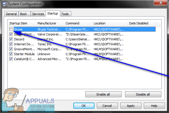 - Locate the listing for Skype within your computer’s startup items, and disable it by unchecking the checkbox located directly beside it.