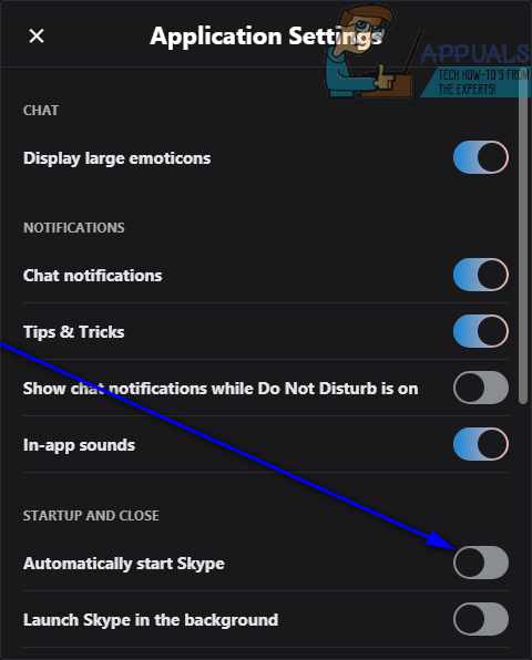- Locate the Automatically start Skype option under Startup and Close and turn it off.
