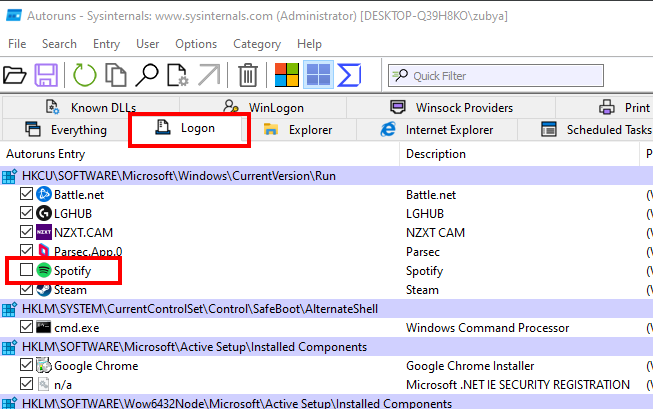 Autoruns is an official tool provided by Microsoft that contains all the startup entries, including the ones that are hidden in the registry. Using this tool, we can remove the Spotify entry, which will prevent Spotify from opening during startup.