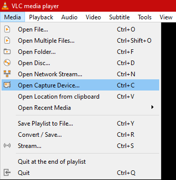 - Open up VLC. Click on Media. From the drop-down, select Open Capture Device.