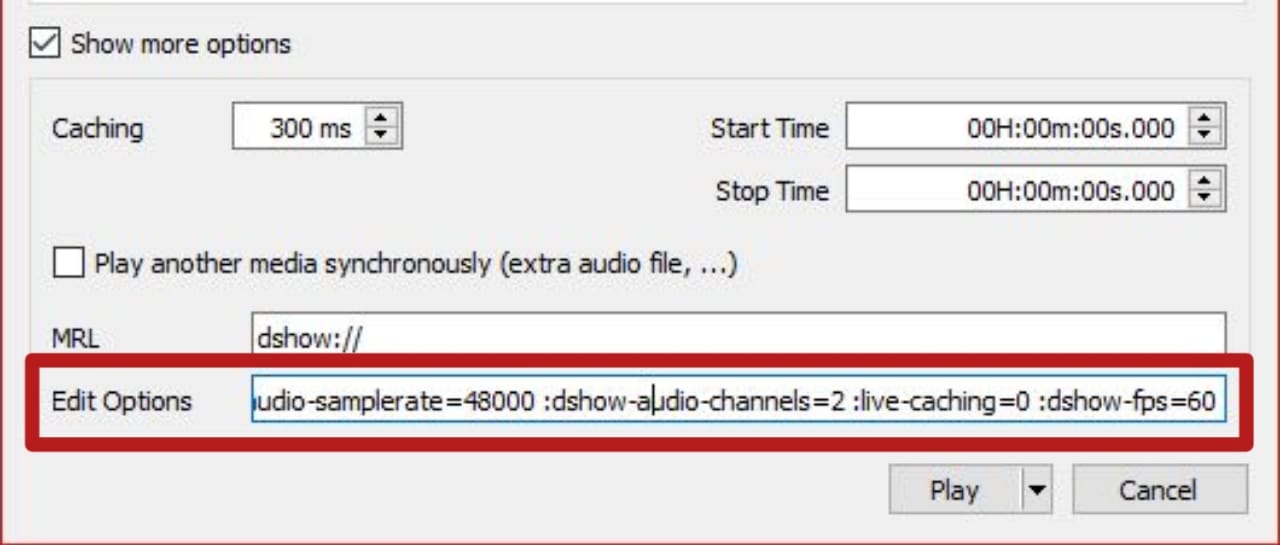 C:\Program Files\VideoLAN\VLC\vlc.exe” dshow:// :dshow-vdev=”Game Capture HD60 S (Video) (#01)” :dshow-adev=”Game Capture HD60 S (Audio) (#01)” :dshow-aspect-ratio=”16:9″ :dshow-audio-samplerate=48000 :dshow-audio-channels=2 :live-caching=0 :dshow-fps=60