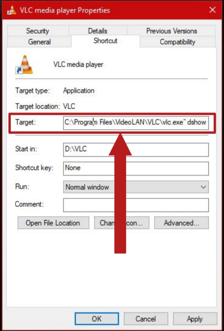 Right-click on the VLC shortcut and select Properties - In the Properties window, there should be Target bar present. Copy the code from your Notepad again and paste it here.