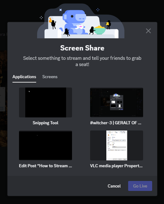 Select VLC from the available apps - After modifying the stream settings on Discord, click on Go Live to begin streaming your Switch. Any time you want to stop, click on the X on the preview thumbnail.