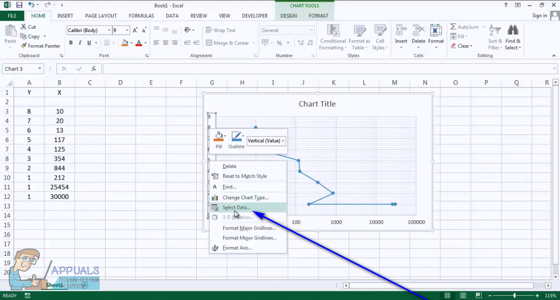 If Excel’s Switch Row/Column option doesn’t work for you, fear not – it isn’t the end of the world (at least not yet). You can still switch the axes of the target scatter chart by manually swapping the coordinates of the graph’s X-axis for the coordinates of the graph’s Y-axis and swapping the coordinates of the graph’s Y-axis for the coordinates of the graph’s X-axis. Manually swapping the coordinates for each of the chart’s axes with each other is bound to get Excel to switch the axes of the scatter chart. If you would like to switch the axes of a scatter chart in Excel using this method, simply: