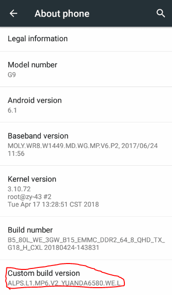 So here is a screenshot of the About > Settings from a fake Huawei G9 LTE. If we look at “Custom Build Number”, we can immediately tell it is running Mediatek firmware, which tells us the phone is definitely fake. Let’s explain this build number piece by piece.