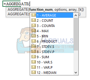 - The first argument in the AGGREGATE() function is the formula you want to use such as SUM(), COUNT() and a few others as you see in the list.