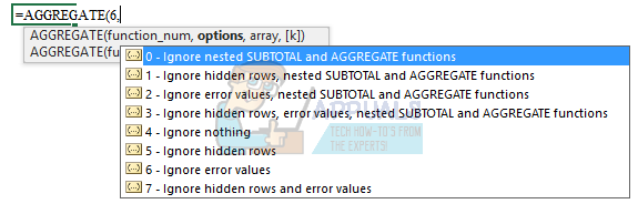 - The second part of the argument are options in which you can incorporate with the formula in the first argument. For the sake of this example and this lesson, you would select option 6, “Ignore error values”.
