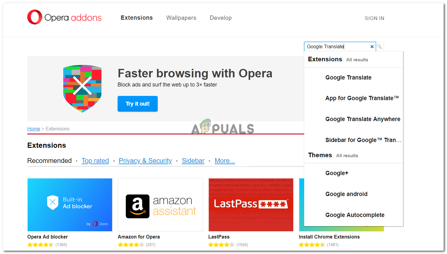 Get Extension. This is where you will find a translating extension for your browser. Note: Google Translate is not the only option you have, but since it is one of the most popularly used extensions, we will opt for it. - This is how a new window will open on the screen with all the add-ons for your Opera browser.