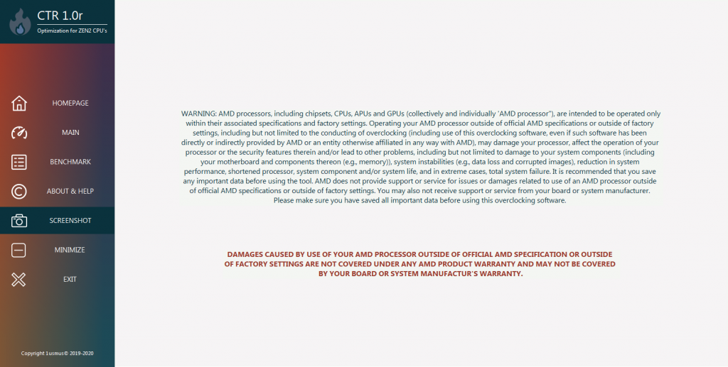 - Firstly, when you open the CTR software, you’ll be greeted by an ominous warning that overclocking using this software may damage your motherboard or CPU. Not to worry though, this is a standard text that must be present on all software with similar features.