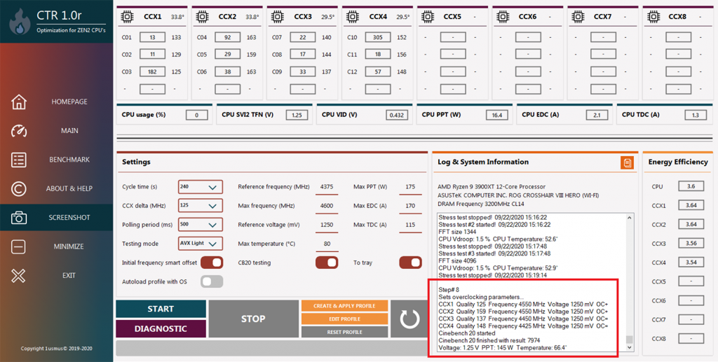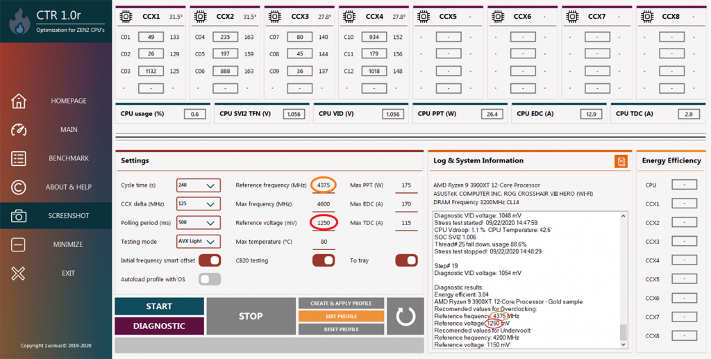 - CTR can provide specific overclocking (or undervolting) values for each specific CCX in the CPU by testing the boosting potential of each core in the CCXs.
