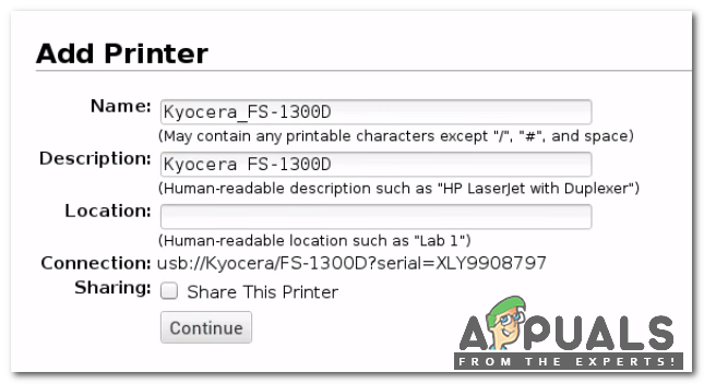 Choosing A Printer - Defining Details Of Printer: Now, we need to give it a name (default name can be given), a description (this is the way our printer will be distinguished to iDevice) and a location (optional). We will ensure that we’ve clicked on Share This Printer and then Continue.