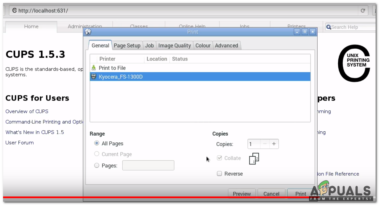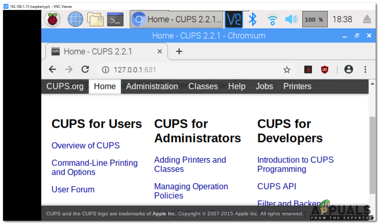 We presently need to add your printer to your print server. To do this, we will have to explore to the CUPS User Interface. Open the web browser on Pi and run the IP : 127.0.0.1:631. The result should be like this :