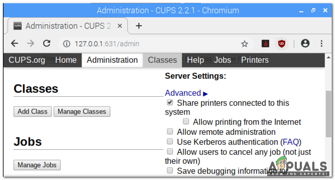 Performance can be made better by fine-tuning some settings. Go to the Administration tab and look for Share printers connected to the system. If we want to add new printers remotely in the future over our network check for Allow Remote Administration. Click on change settings and the server will reboot.