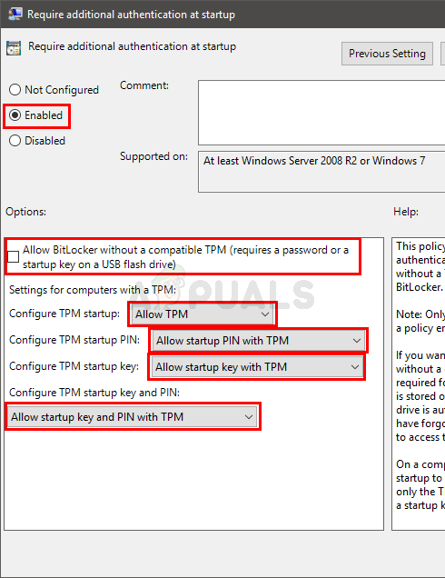 - Select Allow Startup Key and PIN with TPM option from the drop down menu of Configure TPM Startup key and PIN
