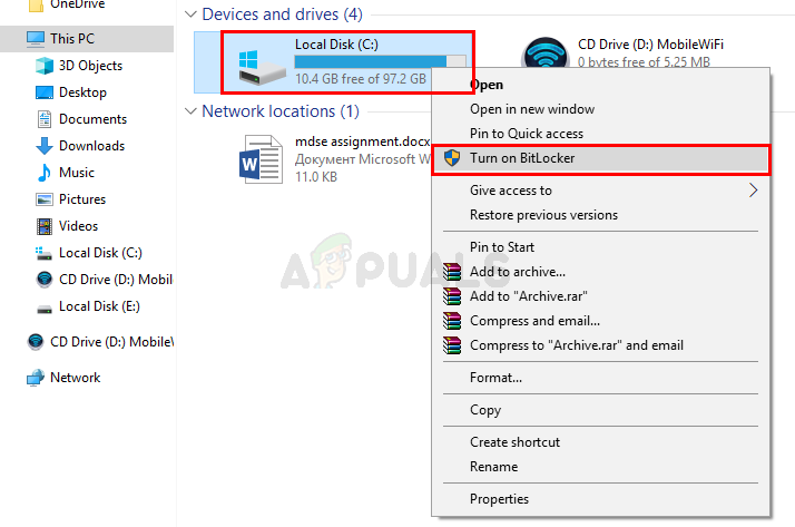 - Right click your C drive and select Turn on BitLocker