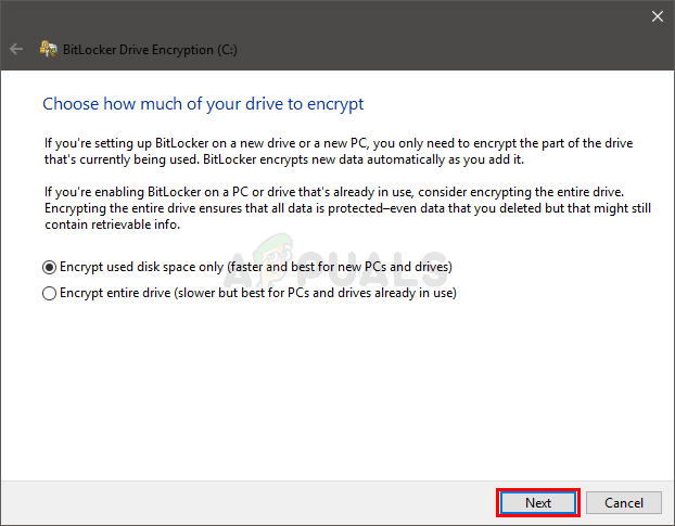 - Once done, you’ll have to pick how much of your drive needs to be encrypted. Select the option that best suits you and click Next