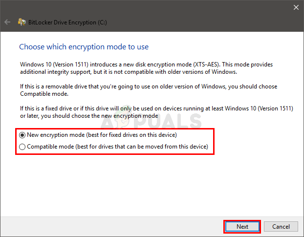 - Now you’ll see a windows asking to you choose which encryption mode to use. You should select New encryption mode if your drive is fixed and will run at least Windows 10. The Compatible encryption mode is suitable for removable devices. Once you select the option, click Next