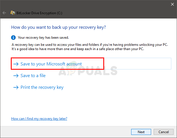 - Save to your Microsoft account option will save the recovery key on your Microsoft account’s one drive. This will work if you are signed in with your Microsoft account.
