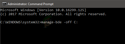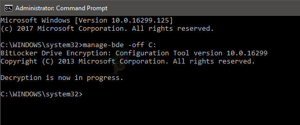 - Type manage-bde -off <drive letter> and press Enter. Note: Replace <drive letter> with the actual drive letter. Your command should look like this manage-bde -off C: