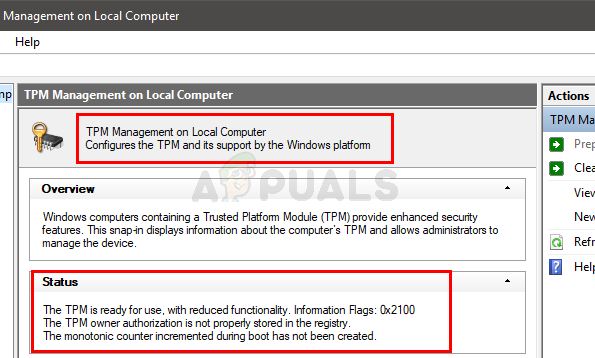 In the middle section of the TPM management console, you should be able to see the status of the TPM. If you don’t have a TPM chip then you will see a message like TPM not found or a variation of that message.