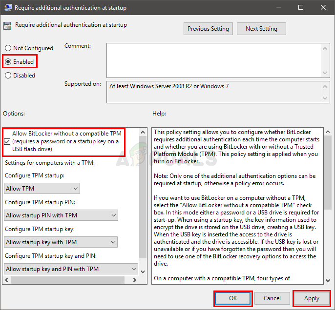 - Select Allow startup key with TPM option from the drop down menu of Configure TPM startup key