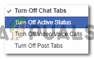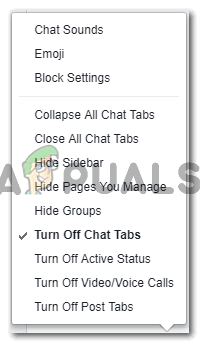 These are the settings options that appear for your Facebook chat. You can close chats, tabs, hide the sidebar, and also change your active status from here. All the options that appear here are actions that you can take for your Facebook chat. - To turn off your Active status on Facebook Chat, you can use the following options, depending on whether you want the entire chat section to be turned off, for all the people on your list or for specific people, or you just want the video call and voice calls to be turned off for a while.