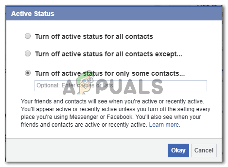 Choose the audience for which you want to hide or switch off your active status on Facebook Chat - Once you have selected the option, you can hit the blue OKAY tab, which will instantly turn off your Active status for all contacts of specific contacts, depending on which option you chose. Your chat bar will now look something like this.