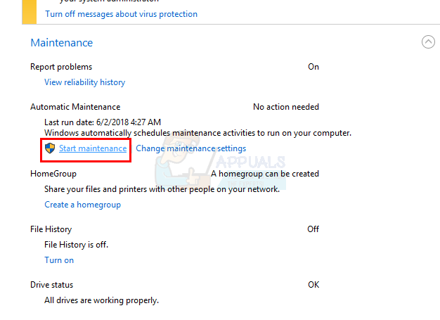 Click the Start Maintenance button. If the status of your maintenance has changed, i.e. it changed to Maintenance in progress (from No action required) then that means your Automatic Maintenance is enabled and you have manually started the Automatic Maintenance. You can click Stop Maintenance to stop the process now.
