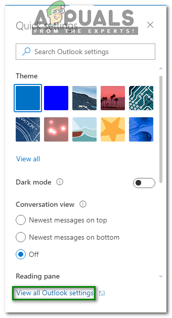- As soon as you will click on this icon, a Quick Settings menu will appear on your screen. Select the link saying, “View all Outlook Settings” from this menu as highlighted in the image shown below: