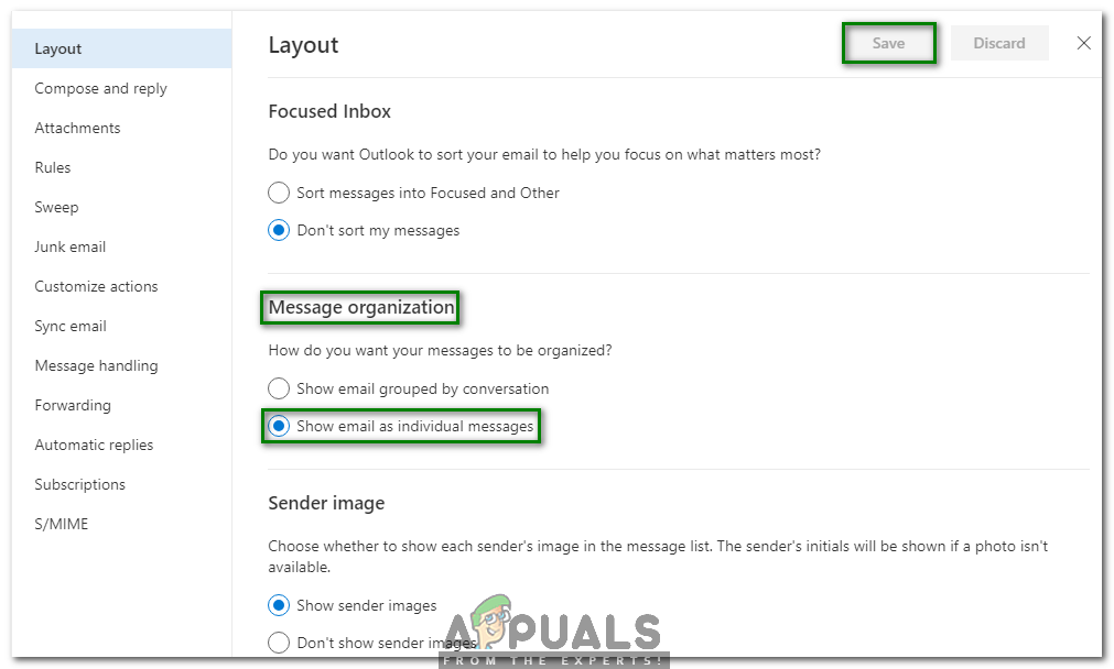 - In the Layout Settings pane, scroll down to the Message Organization heading and then choose the “Show email as individual messages” radio button as highlighted in the following image: