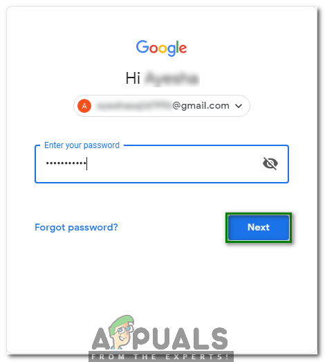 - Type the password of your Gmail account and then click on the Next button as highlighted in the image shown below: