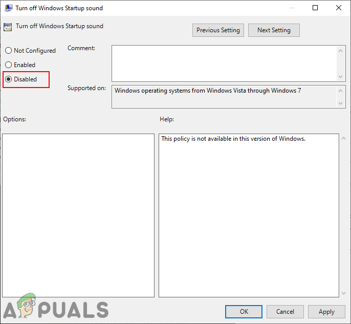 The Group Policy Editor method will also turn ON and turn OFF the Startup sound. However, this method will also grey out the option that we used in the first method. It will stop standard users from changing the option in the first method. The description of the policy says, it is not available in this version of Windows, however, it still works for some reason. We have included the force update step, but if it automatically updates the changes for you, then skip that step.