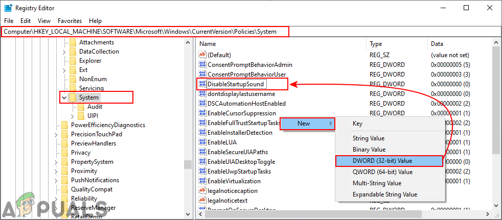 - Right-click on the right pane of the System key and choose the New > DWORD (32-bit) Value option. Then rename the value as “DisableStartupSound” and save it.