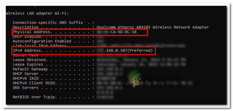 - Once you get returned the results, scroll down to the network adapter that is currently connected to the internet and look for Physical Address (MAC Adress) and IPv4 Adress (IP Adress).