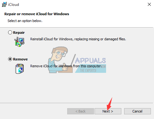 - iCloud’s uninstall wizard should open with two options: Repair and Remove. Select Remove and click Next in order to uninstall the program.
