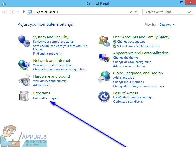 - With the Control Panel in Category view, click on Uninstall a program under the Programs section.