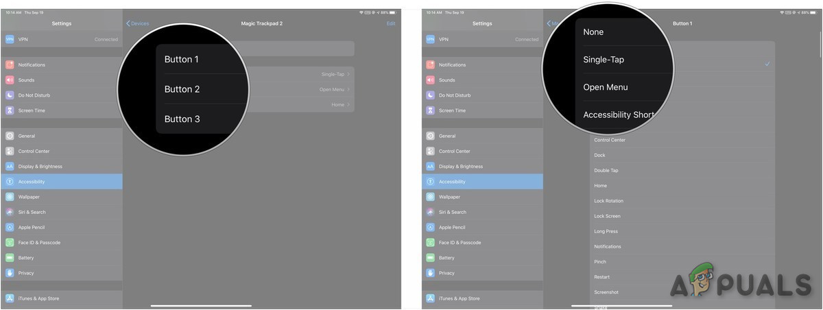 - Now tap on the action for each button of the pointing device that you want to change when it’s pressed. The “action” options range from simple actions e.g. single-tapping to opening the dock. A particular Siri Shortcut can also be assigned to one of your mouse buttons.