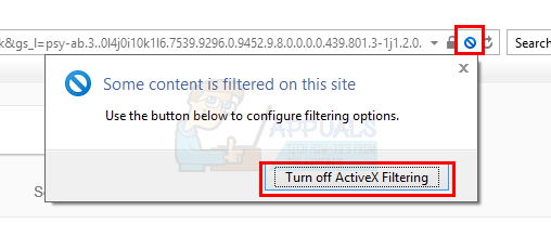- A pop-up will appear on the screen, confirming you to turn off the ActiveX filtering. Click on the “Turn off ActiveX Filtering” button.