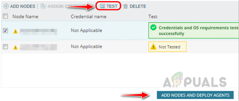 - Now, select the node and click on Test to validate whether the credentials used to monitor the node has enough privilege to deploy the sensor. We cannot deploy the sensor if the credentials don’t have enough privileges. Use a credential with enough privilege to deploy the sensor.