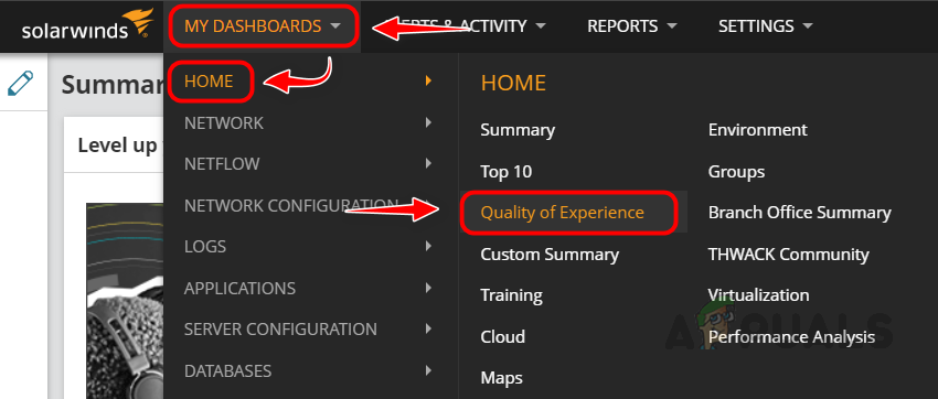- Please hover your mouse over My Dashboards and click on Home. Click on Quality of Experience in the Home sub-menu.