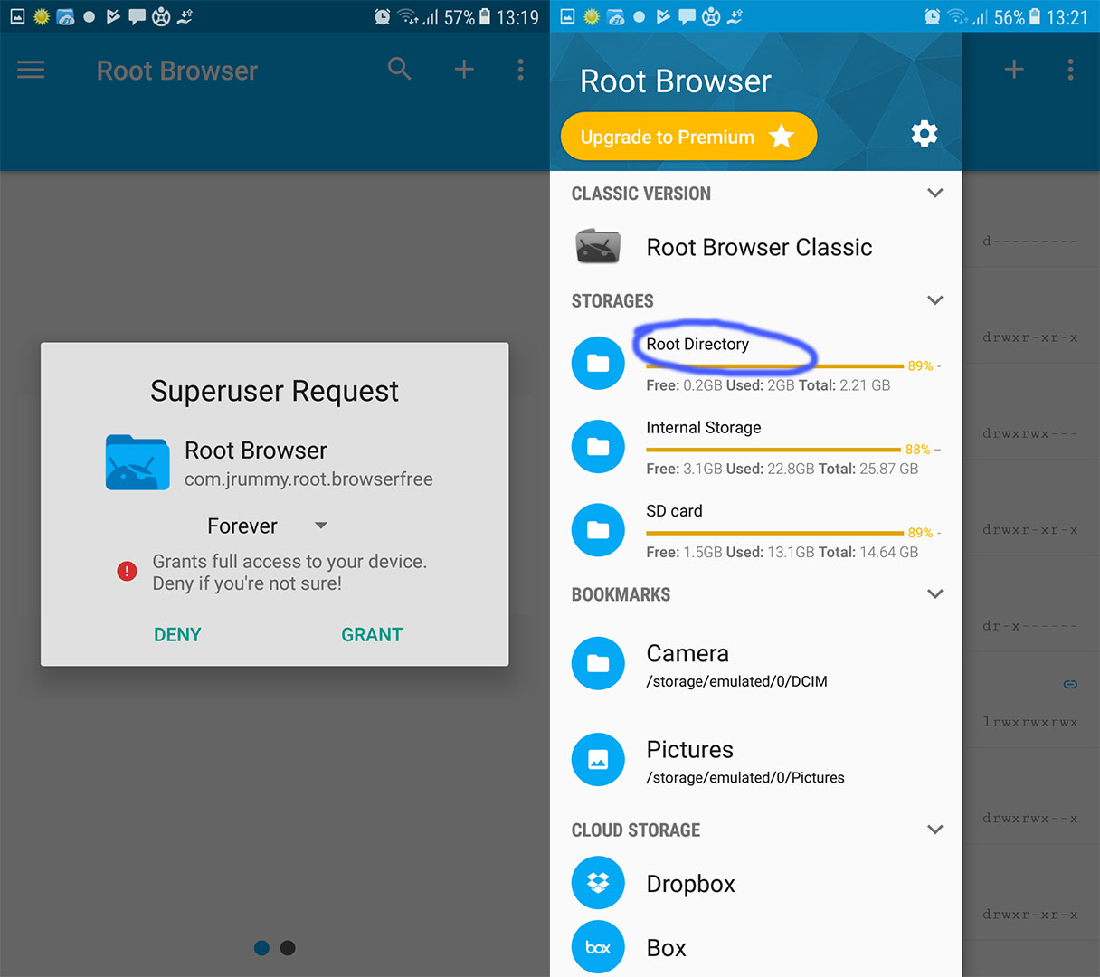 - First, open Root Browser File Manager and grant it root access. Next, swipe from the left edge of your screen and open the “Root Directory” section.