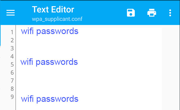 - Open the file with the text editor. In this file, you can see all the WiFi networks stored on your Android device. Scroll down and find the one that you need. Although this procedure is a little more complicated than the previous ones, it is worth trying.